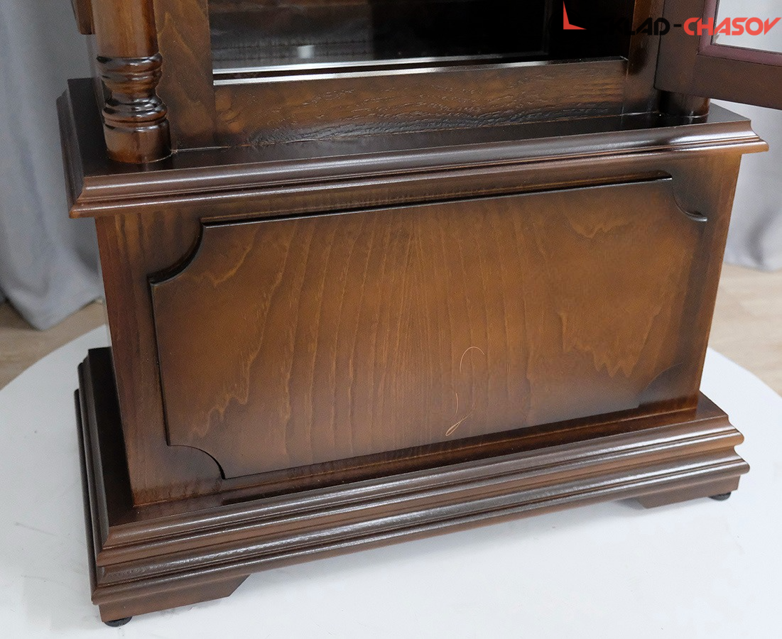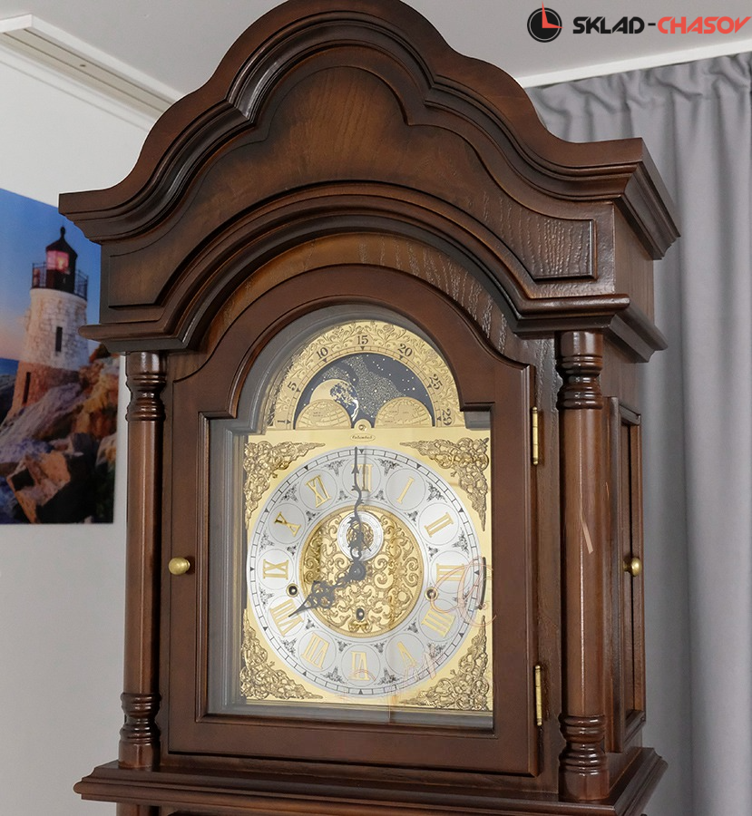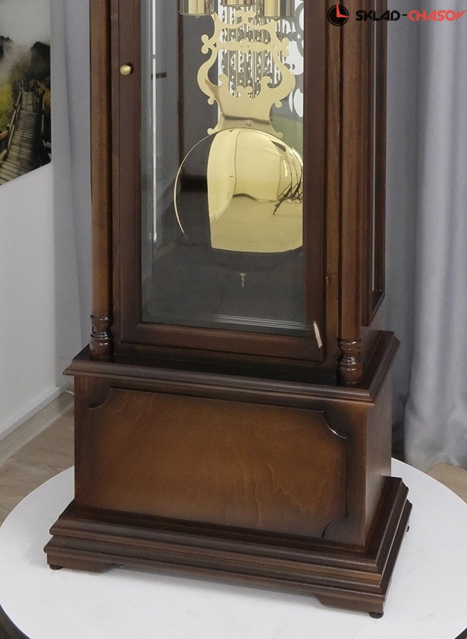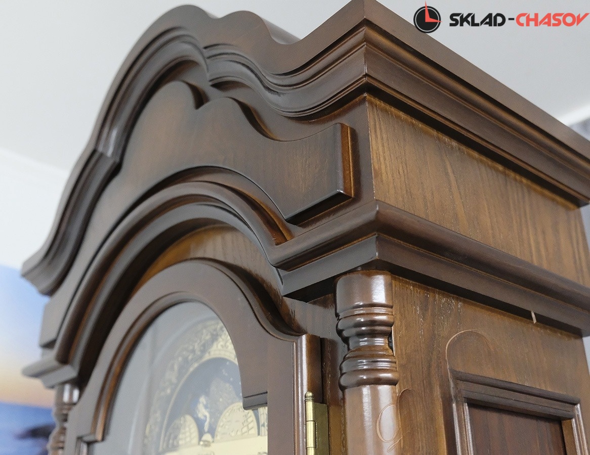 Фасад корпуса этой модели механических напольных часов изготовлен из отборных пород твердого дерева.