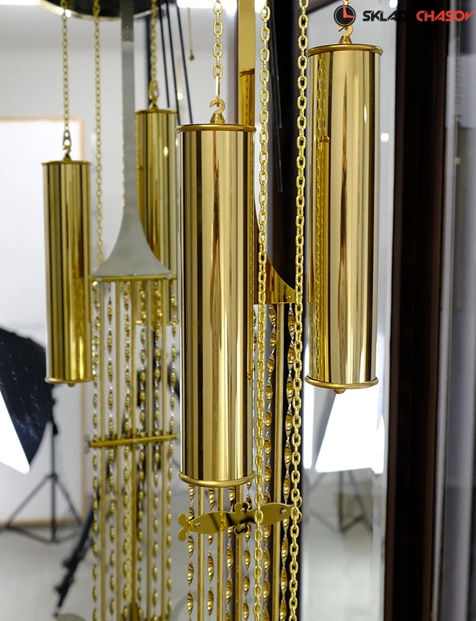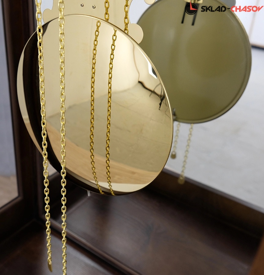 Позолоченный маятник и гири завершают декоративный ансамбль часов;