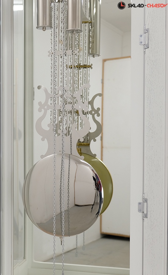 Никелированные маятник и гири завершают декоративный ансамбль часов;