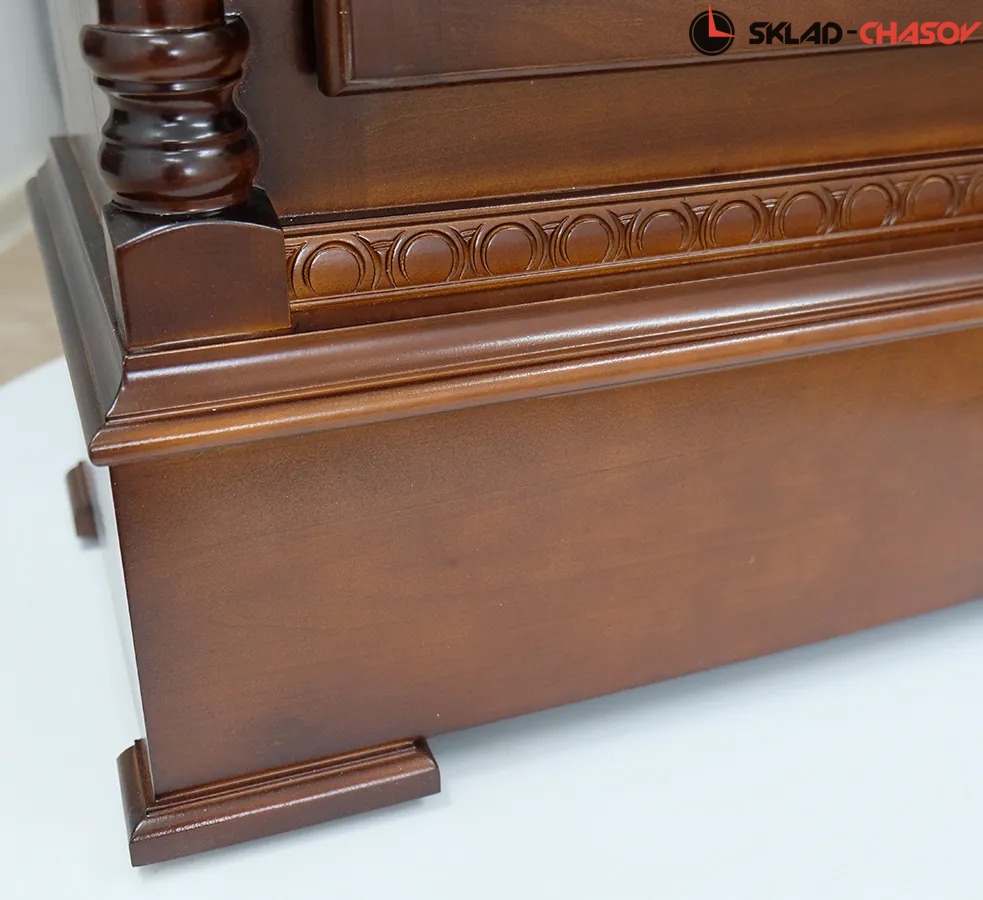 Остекление по всей высоте дверцы, открывает вид на маятник и гири из полированной латуни;