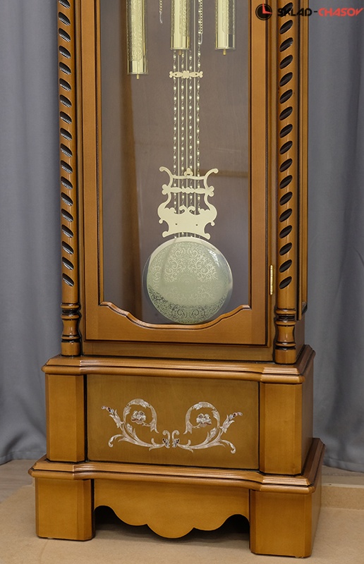Маятник и гири, из полированной латуни, повторяют узорами центральный диск циферблата.
