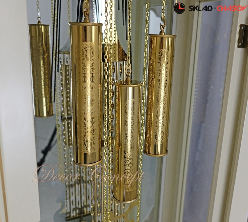 Задняя зеркальная стенка подчеркивает красоту маятника с декоративным диском и гирь из полированной латуни;