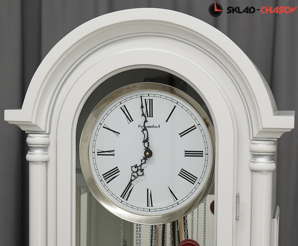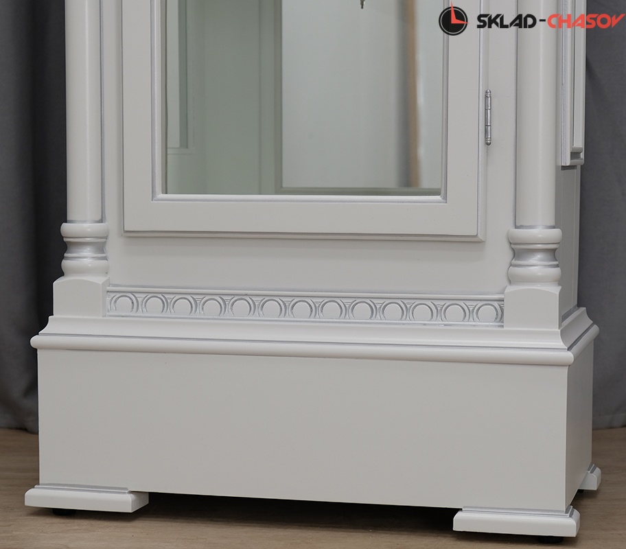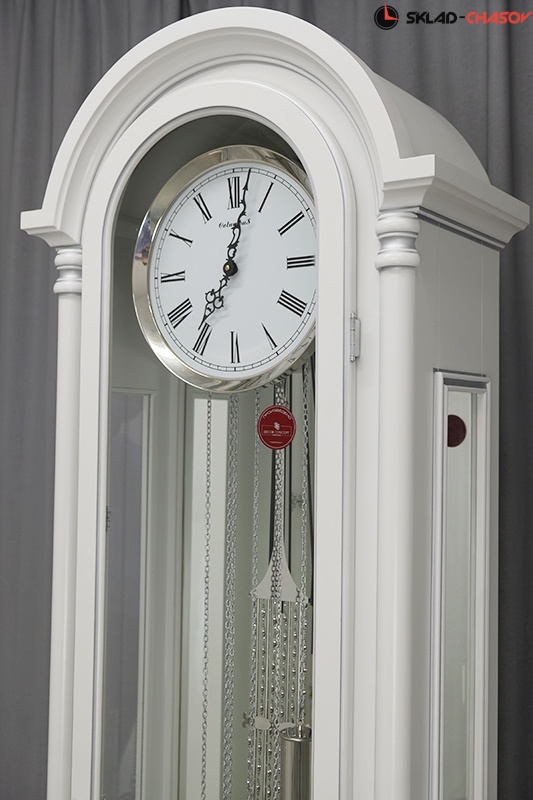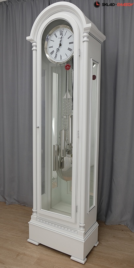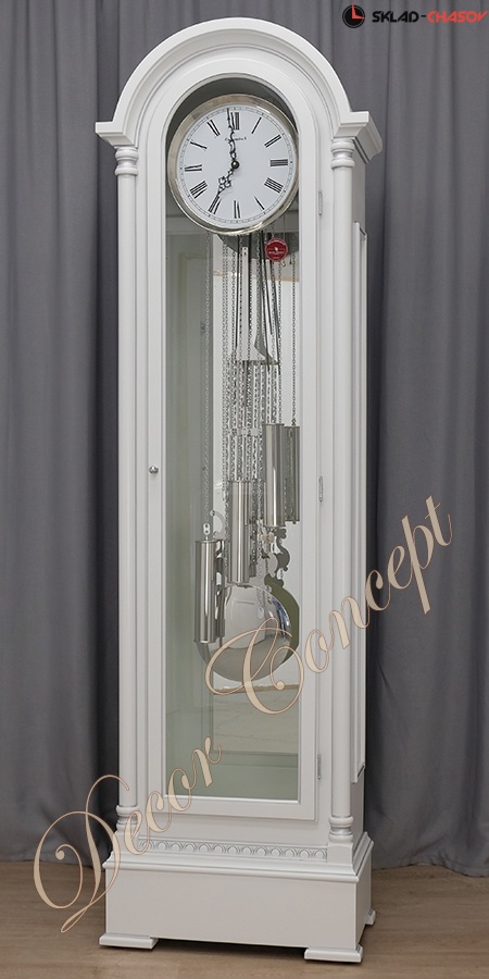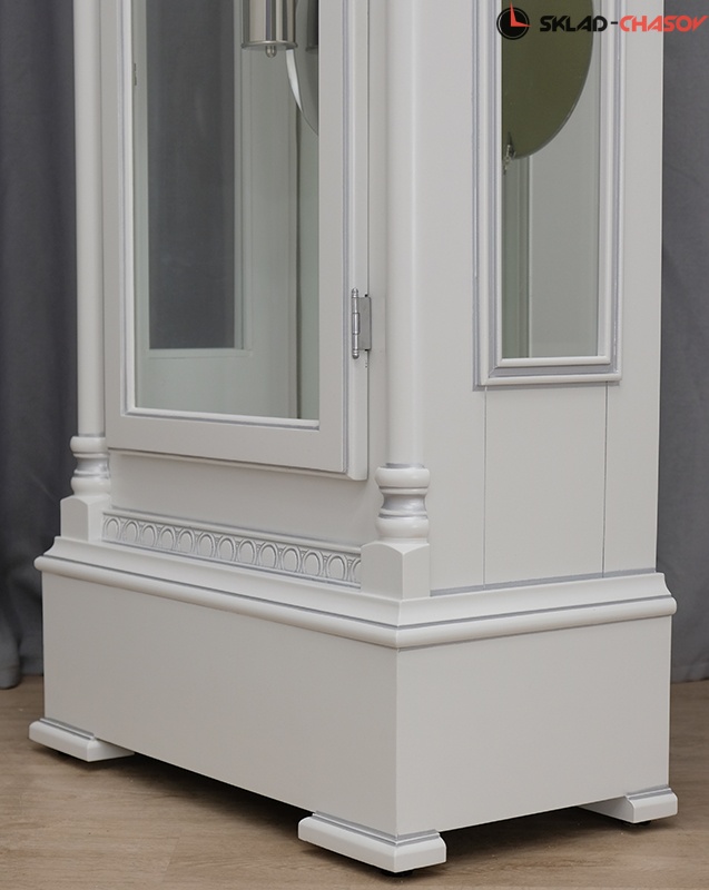 Элементы фасада корпуса изготовлены из отборных пород твердого дерева. Тонирование корпуса выполнено в белом цвете с серебряным патинированием. Корпус выполнен в строгом классическом стиле «Викторианской» эпохи, с округлой вершиной фронтона. Остекление по всей высоте дверцы, открывает вид на маятник и гири из полированной стали. Циферблат крупный, белый заключен в никелированную оправу, которая гармонирует с цветом тонировки корпуса. Маятник в форме лиры покрыт полированным никелем. Гладкие никелированные гири завершают декоративный ансамбль часов; Механизм Hermle с гиревым подвесом. Бой на каждые 15 мин, полчаса и час, ручное отключение боя. Вес - 35 кг.