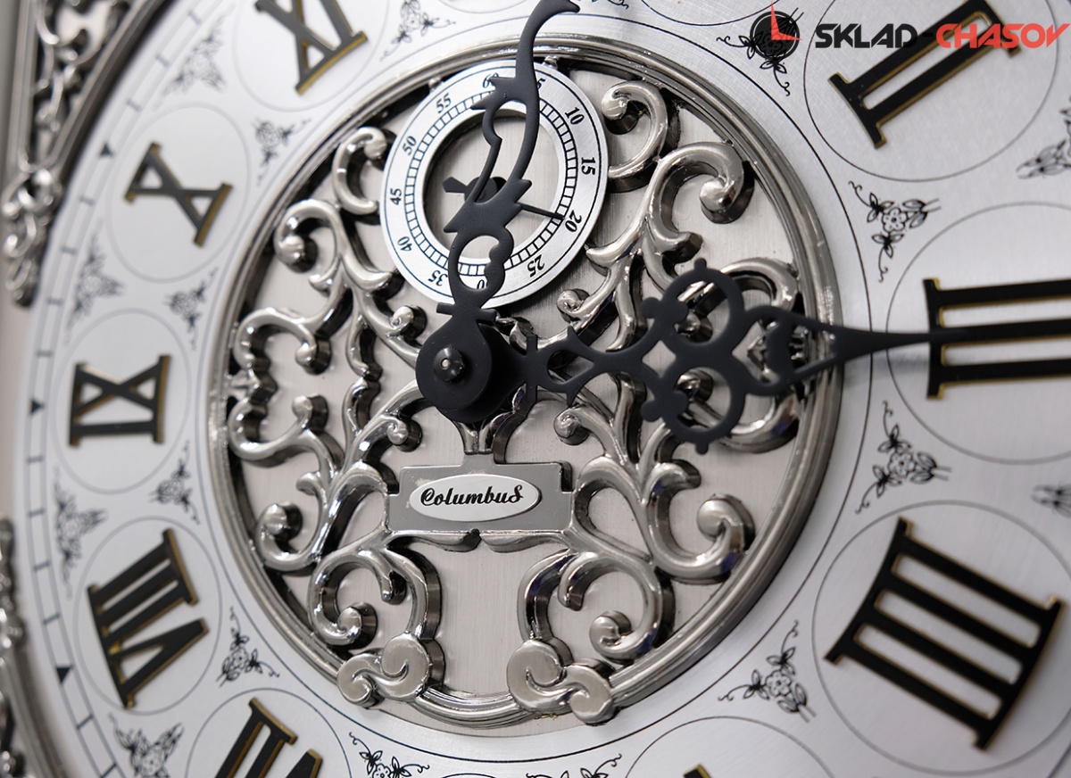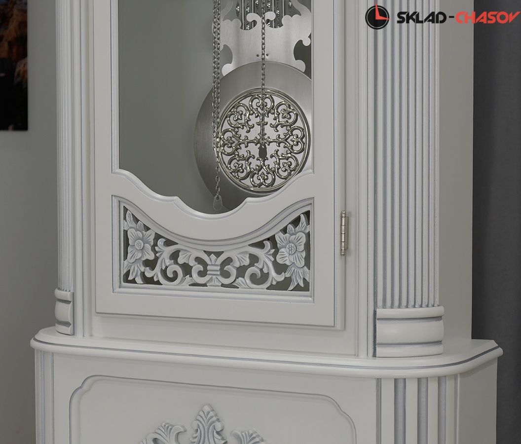 Циферблат обрамлен хромированными надсводными уголками повторяющими узор на маятнике;