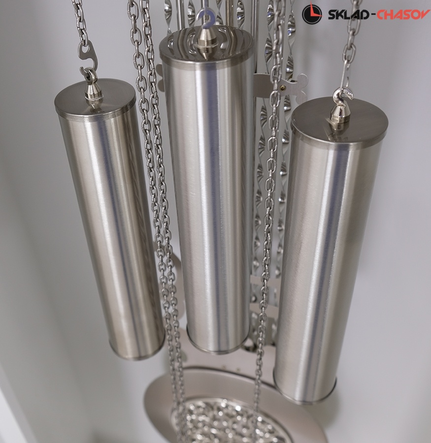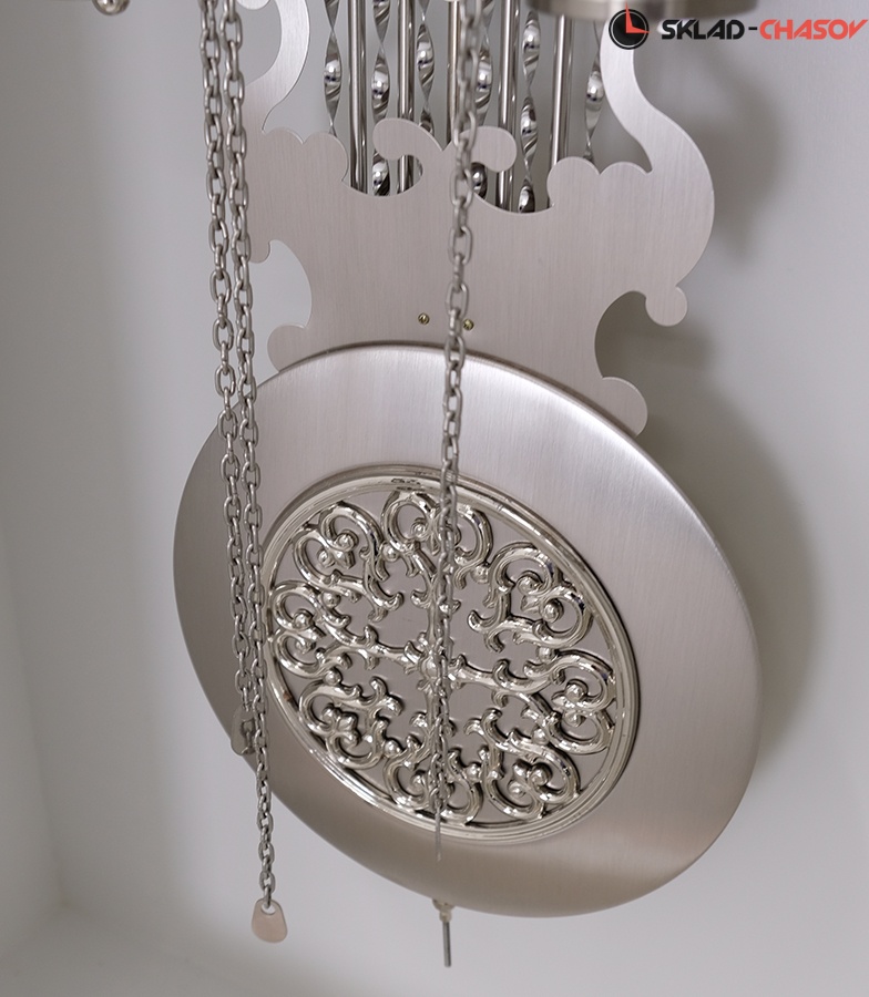 Матовый никель циферблата, гирь и и маятника, придает изысканную элегантность;