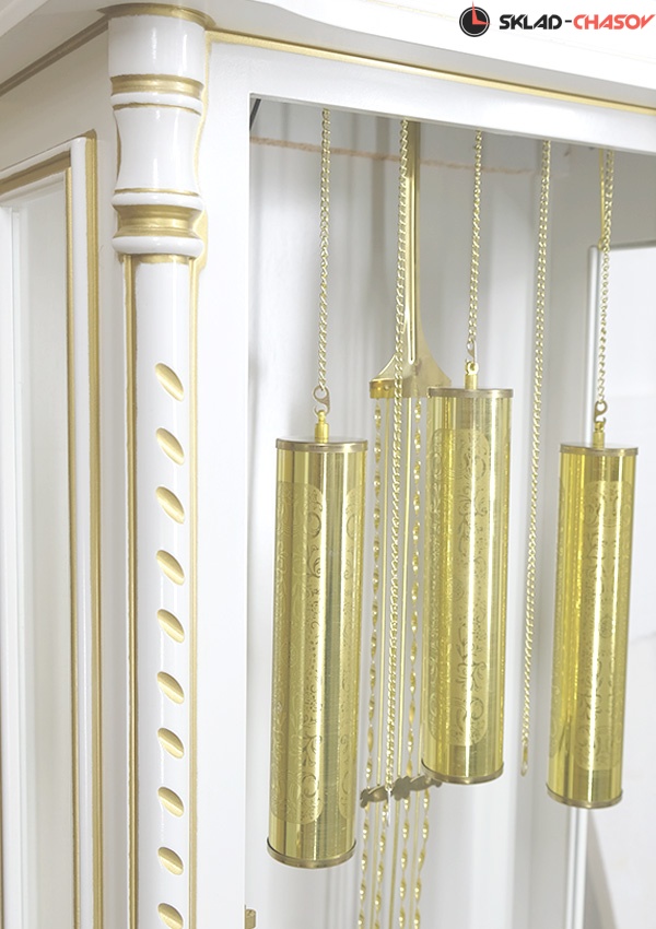 Позолоченные гири и маятник ,цвета полированной латуни, изысканно подчеркивают общую тонировку часов;