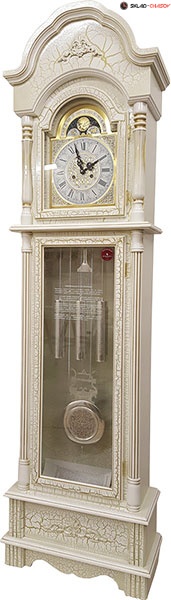 Деликатность (Delicacy). Напольные часы выполнены из массива дерева в цвете слоновая кость с применением патинирования под «золото» способом кракелюр. Корпус украшен арочным фронтоном с накладными резными элементами. Над циферблатом расположен механизм, имитирующий лунный календарь. Сам циферблат выполнен из латуни с узором по центру и надсводными уголками. Этот же узор повторяется на маятнике. Крупногабаритный товар.