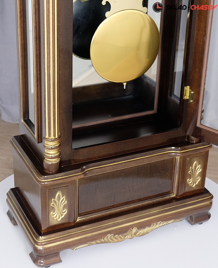 Задняя зеркальная стенка подчеркивает красоту маятника с декоративным диском и гирь из полированной латуни;
