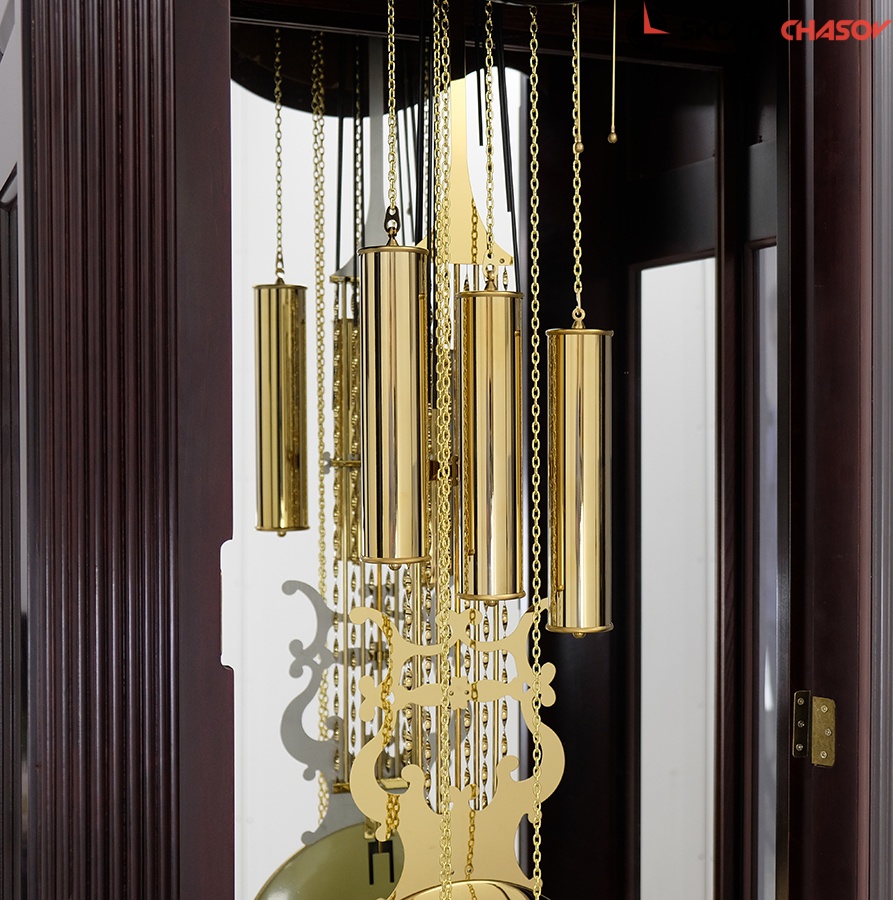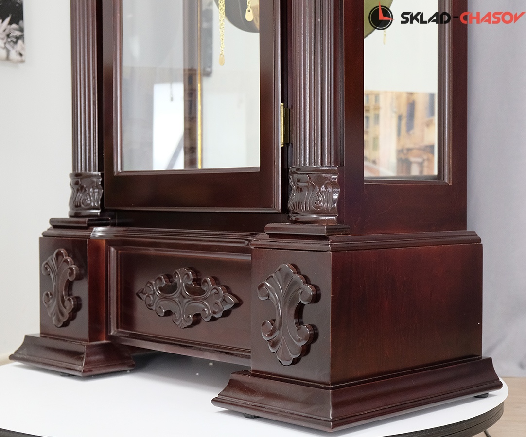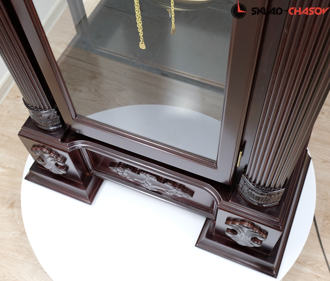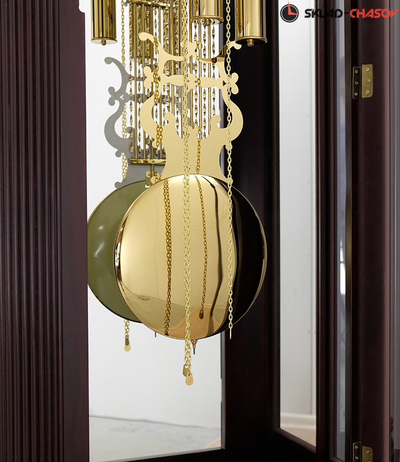 Остекление по всей высоте корпуса открывает вид на маятник и гири из полированной латуни;