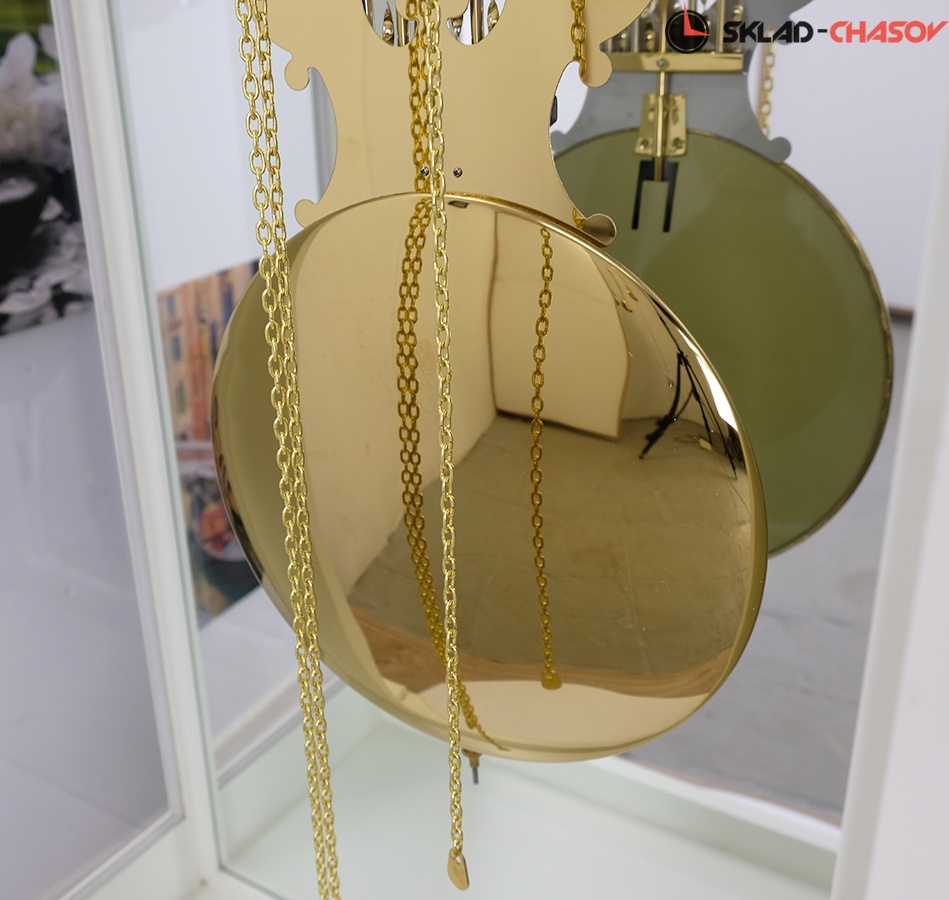 Остекление по всей высоте корпуса открывает вид на маятник и гири из полированной латуни;