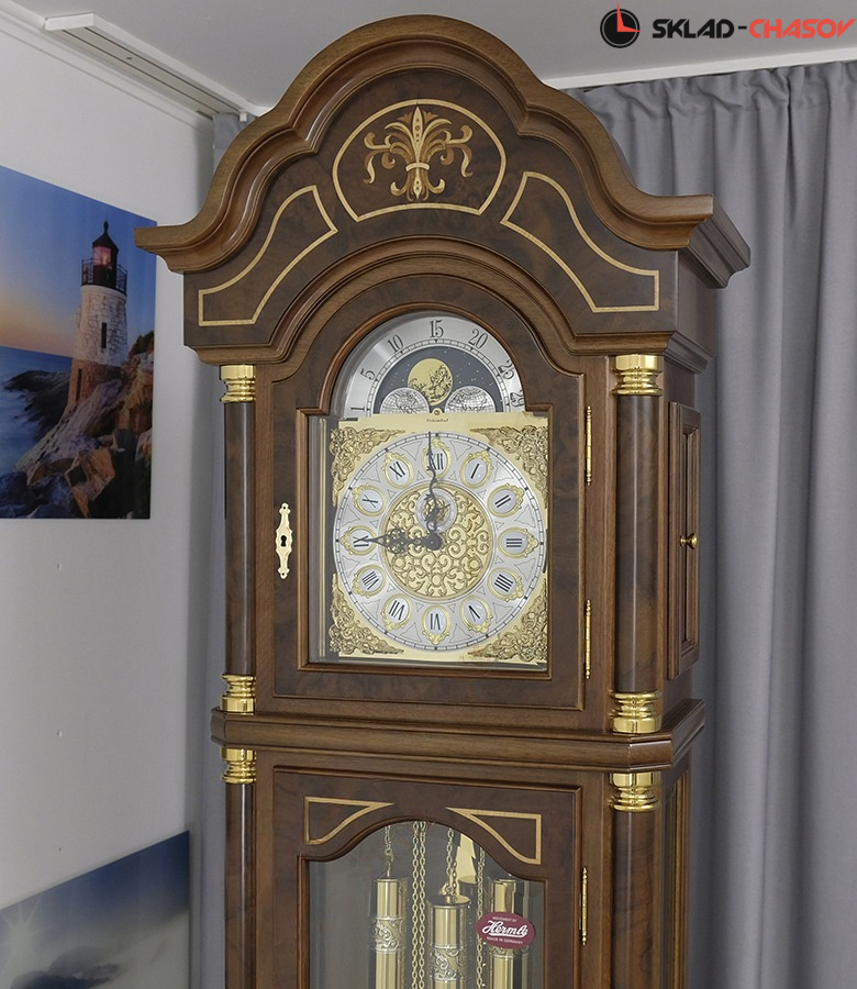 Тонирование деревянного корпуса напольных часов выполнено в классическом цвете — орехового дерева.