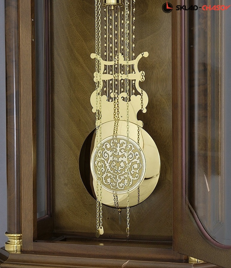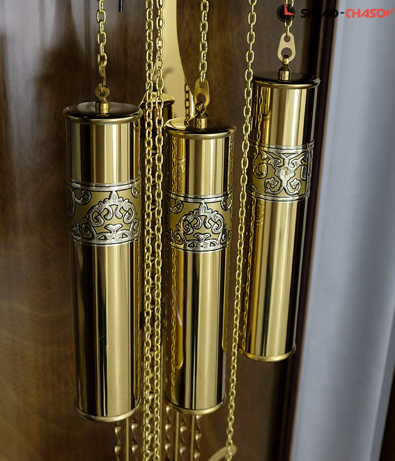Гладкие позолоченные гири и маятник с рельефным узором завершают декоративный ансамбль часов.
