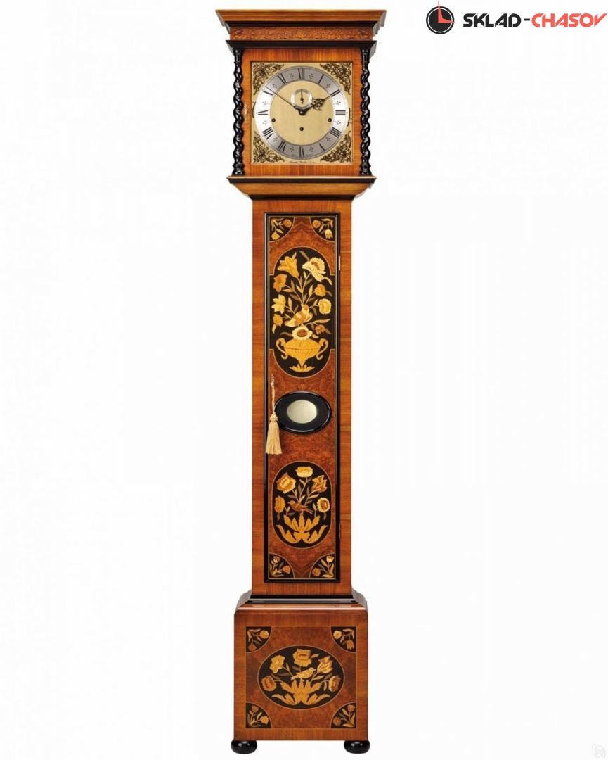 Превосходная копия напольных часов Джожефа Книба (1640-1711). Сертификат аутентичности. Инкрустация на корпусе изображает птиц и цветочные мотивы, столь популярные в столярных изделиях периода Короля Уильяма III и Королевы Марии II. Верх часов украшают резные колонны ручной работы. Массивный латунный циферблат украшен посеребренным кольцом с черными цифрами. Корпус выполнен из самшита, груши, грецкого ореха и черного платана. Корпус вручную навощен для эффекта античной старины.