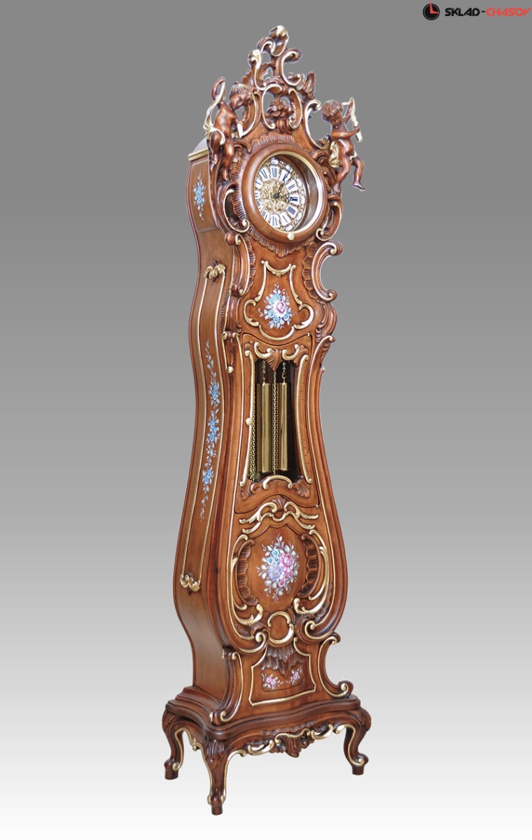 Часы выполнены из резного дерева в стиле Барокко.