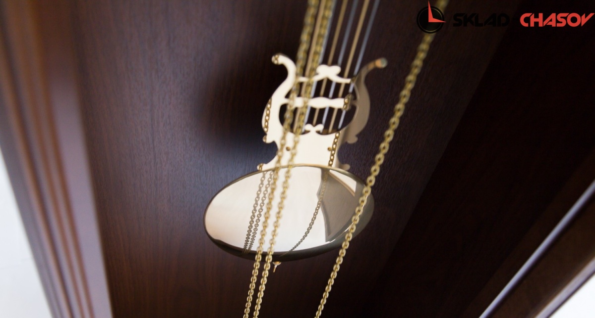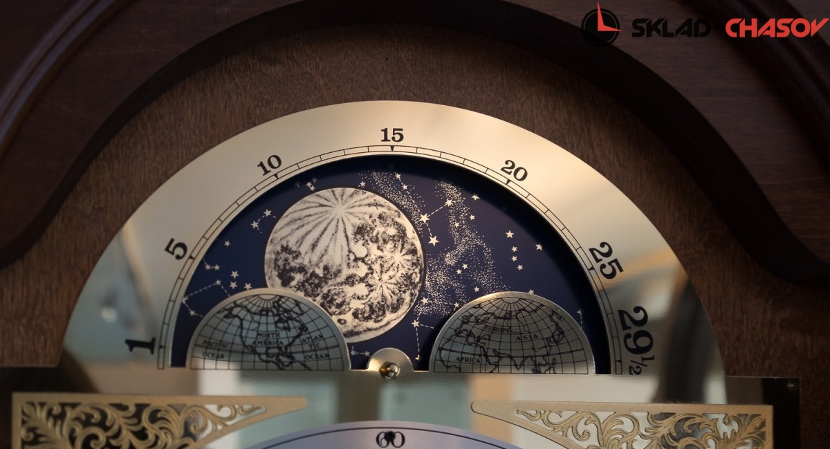 Механизм механический с цепным подвесом гирь, восьмидневный завод. Мелодия Westminster каждые 15 минут. Бой каждый час. Календарь: над циферблатом расположен механизм, демонстрирующий фазы Луны. Маятник полированный, с лирой.