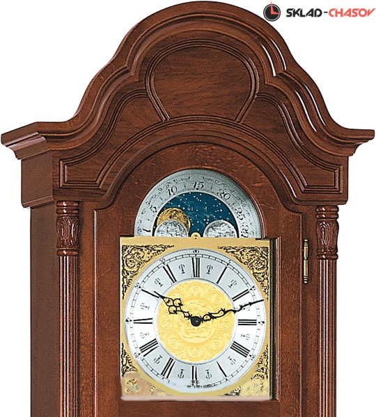 Механические напольные часы Hermle 01159-N90461 имеют надежный механизм, ручное и автоматическое отключение мелодии. Над циферблатом расположен механизм, демонстрирующий фазы луны и нецентральная секундная стрелка.