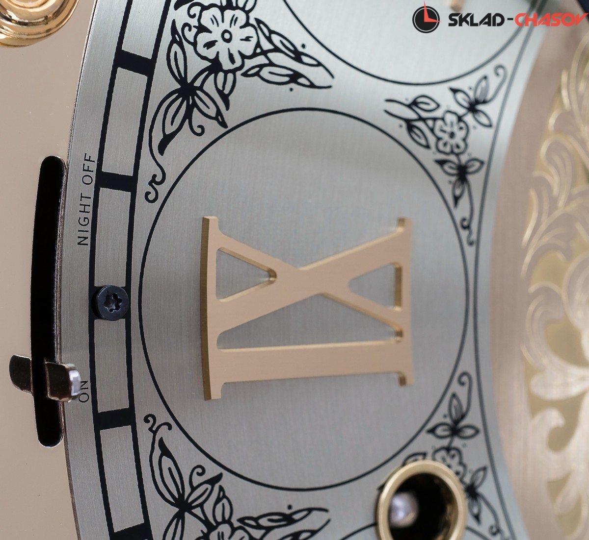 Механический механизм с тросовым подвесом гирь. Запас хода - 8 дней. Цвет орех. Латунный с чеканными римскими цифрами, по центру и углам установлены узорные накладки с чернением. Отдельный циферблат с секундной стрелкой. Лирообразный маятник изготовлен из полированной латуни. Бой каждые 15 минут с нарастанием длительности мелодии. Автоматическое и ручное отключение боя в ночное время. Мелодии: Вестминстер, Уиттингтон, Святой Михаил...