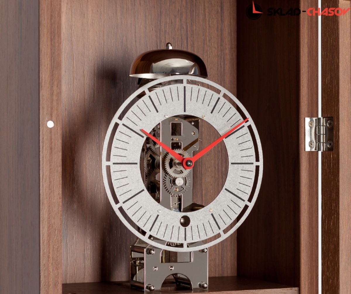 Дизайнерские напольные часы-скелетон. с никелированным механизмом 0791 на тросовом подвесе гири, имеющий 8-ми дневный запас хода. Бой каждый час - один удар в колокол. Бой не отключается!