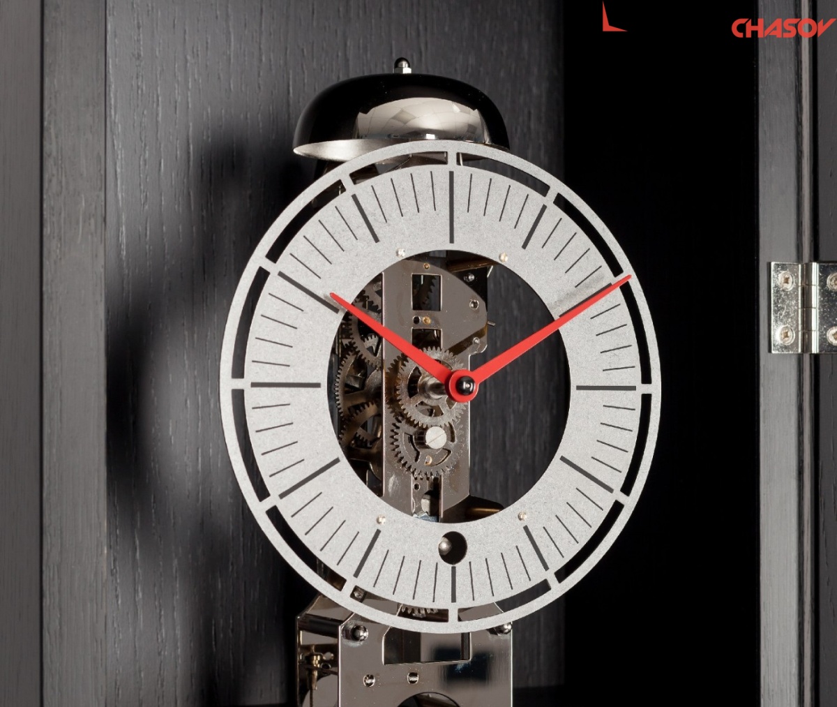Дизайнерские напольные часы-скелетон с никелированным механизмом 0791 на тросовом подвесе гири, имеющий 8-ми дневный запас хода. Бой каждый час - один удар в колокол. Бой не отключается!