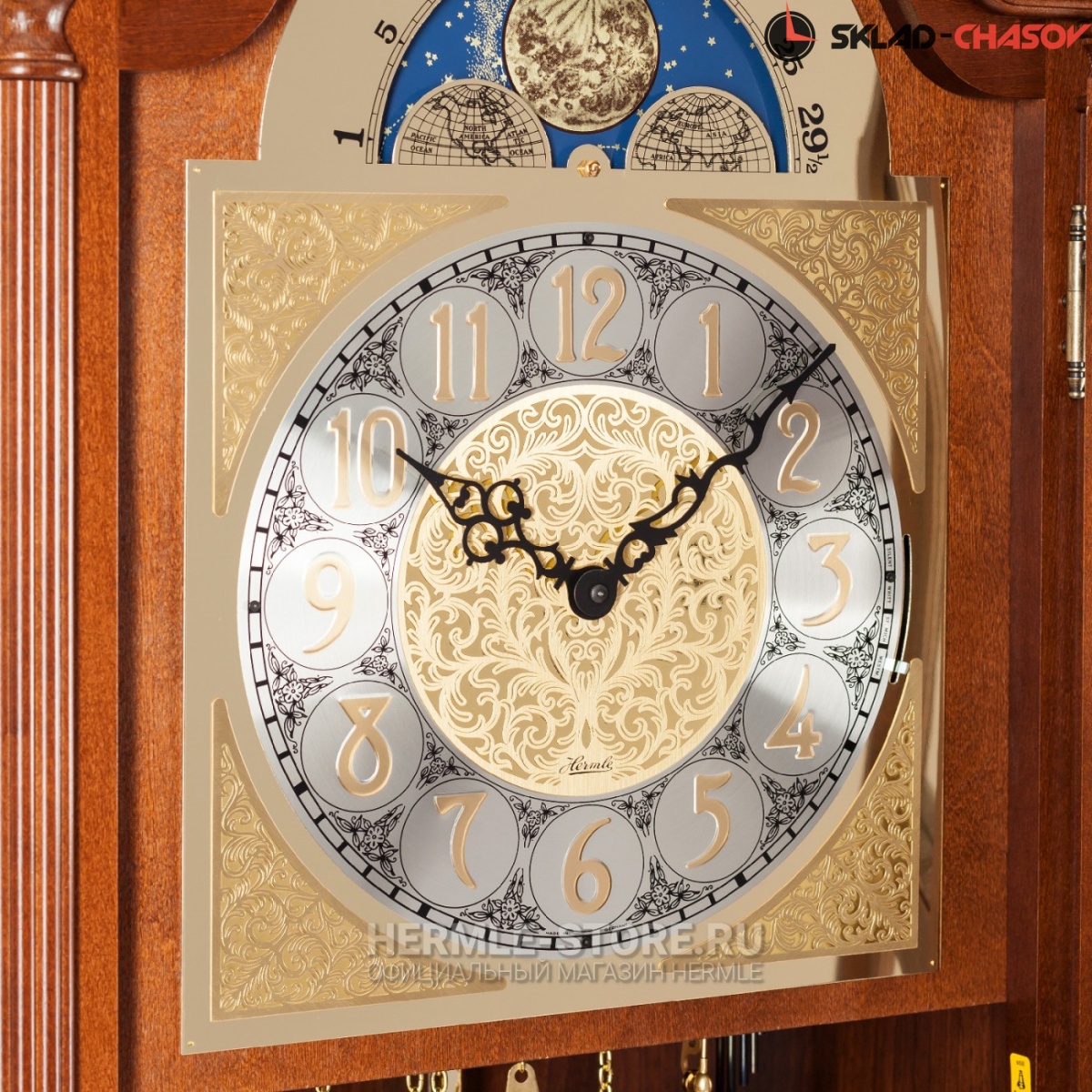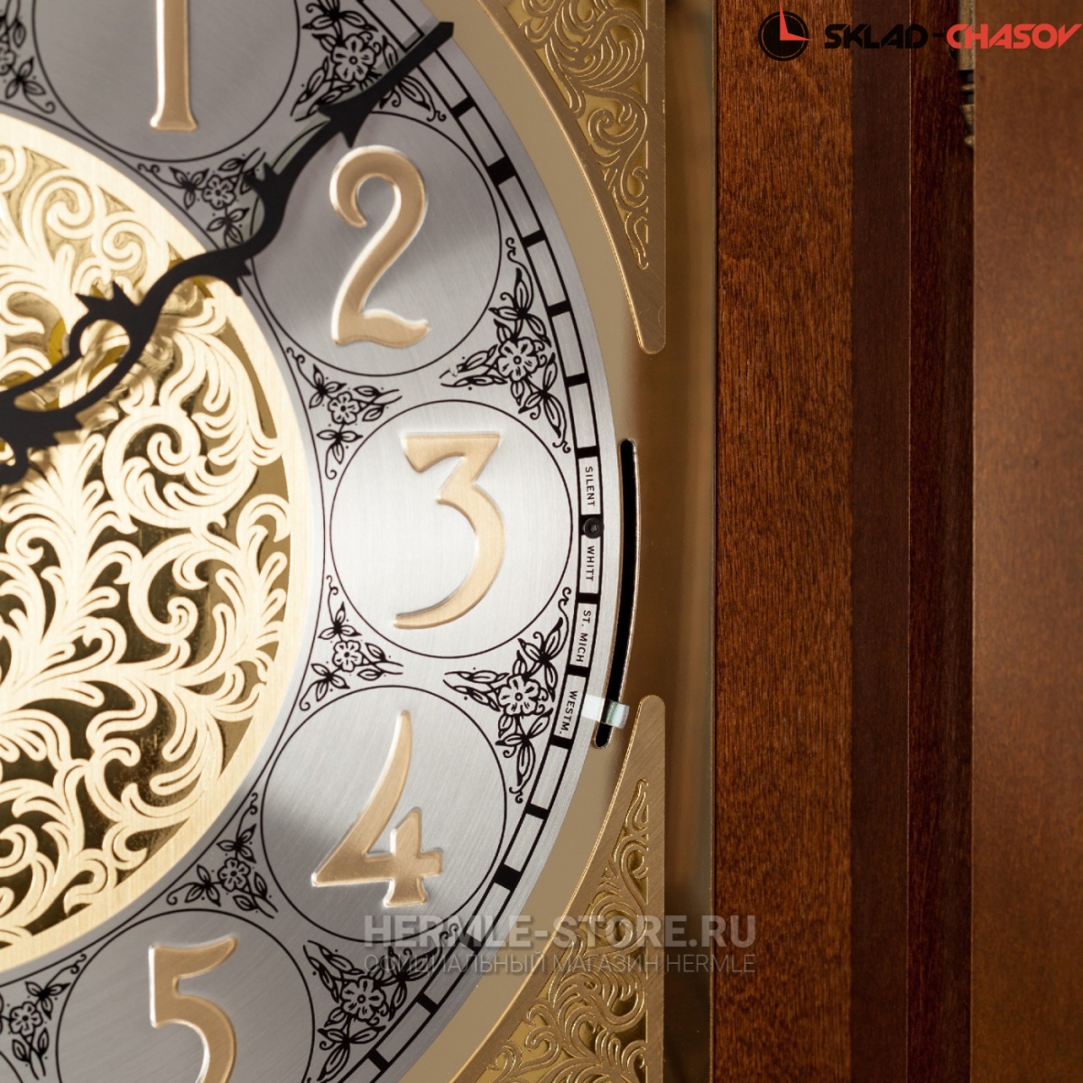 Модель с тремя мелодиями и стержневыми гонгами в корпусе цвета орех. Впервые в России. Латунный с чеканными арабскими цифрами. По центру и углам искусно инкрустирован орнаментом Бой каждые 15 минут с нарастанием длительности мелодии. Автоматическое и ручное отключение боя в ночное время Лирообразный маятник изготовлен из полированной латуни