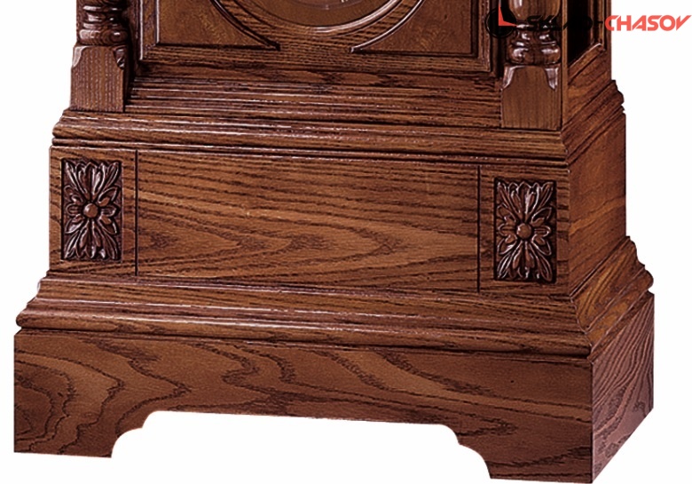 Дополнительные резные элементы акцентируют внимание на многоярусном корпусе часов, который украшают каннелированные колонны с резными капителями.