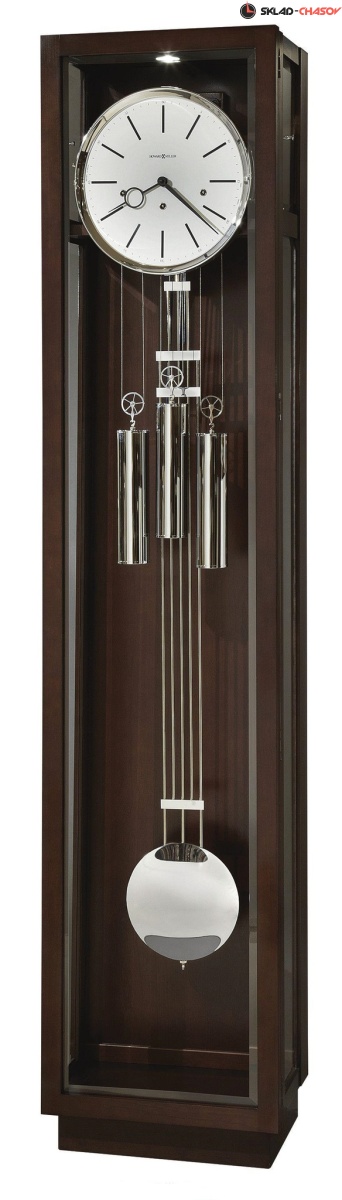 Решетчатый маятник, отделанный полированным хромом, прекрасно вписывается в линейный дизайн этих часов.