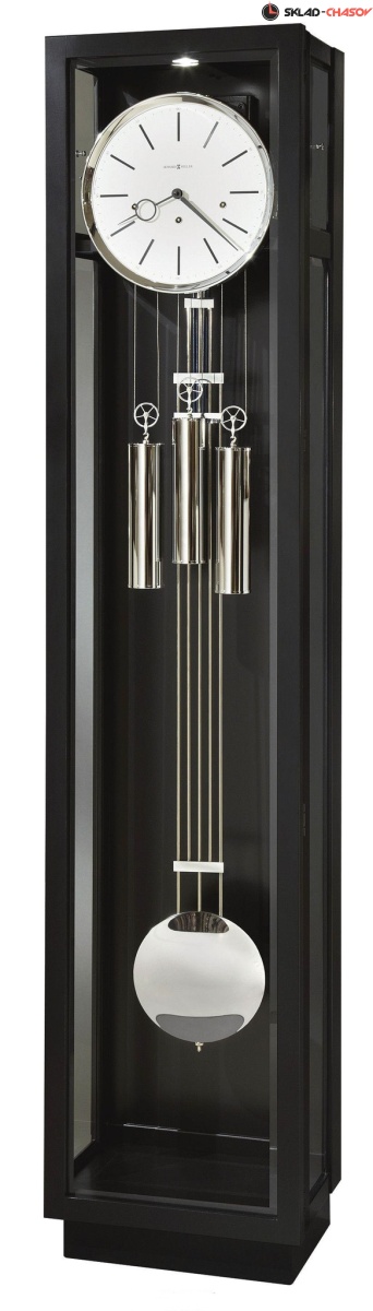 Решетчатый маятник, отделанный полированным хромом, прекрасно вписывается в линейный дизайн этих часов.