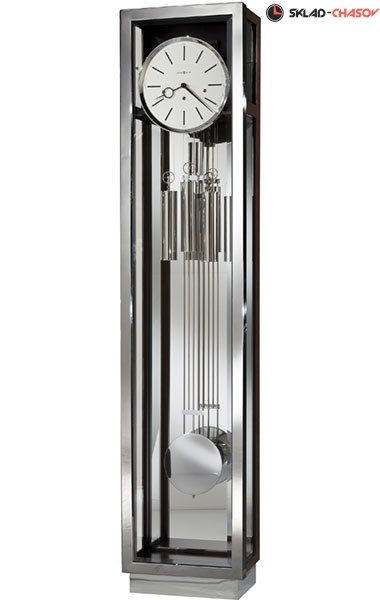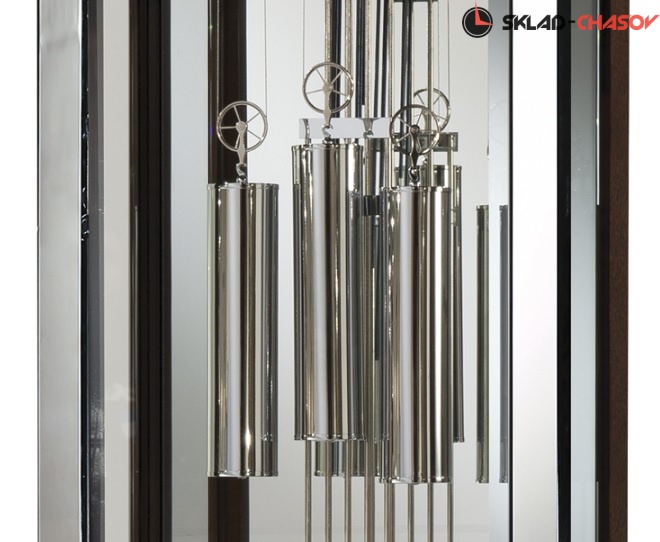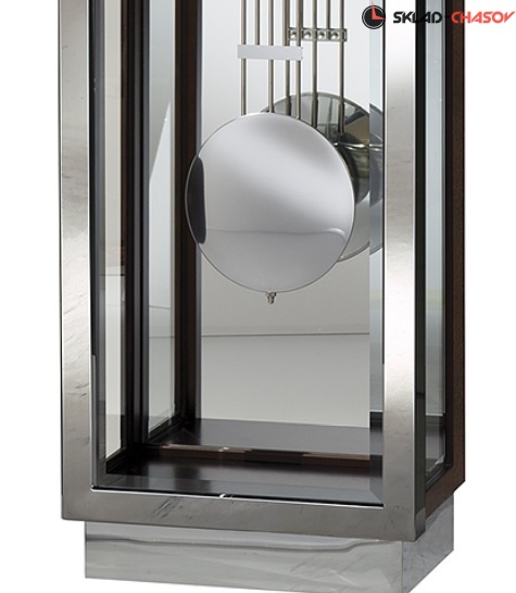 Решетчатый маятник, отделанный полированным хромом, прекрасно вписывается в линейный дизайн этих часов.