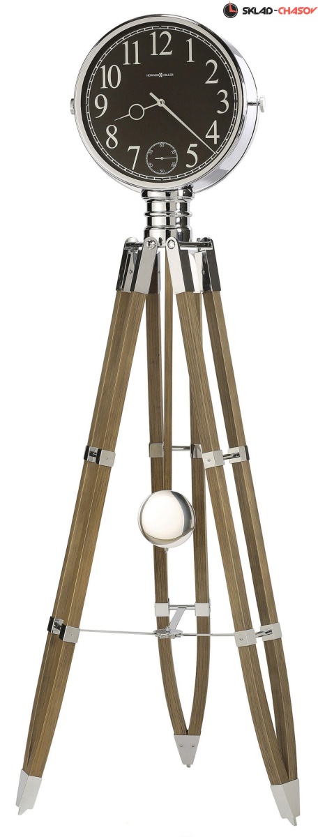 Дизайн этих напольных часов в виде треножника с циферблатом заимствован у прожекторов со съемочных площадок Голливуда эпохи ретро. Хромированный и полированный корпус богат металлическими акцентами.