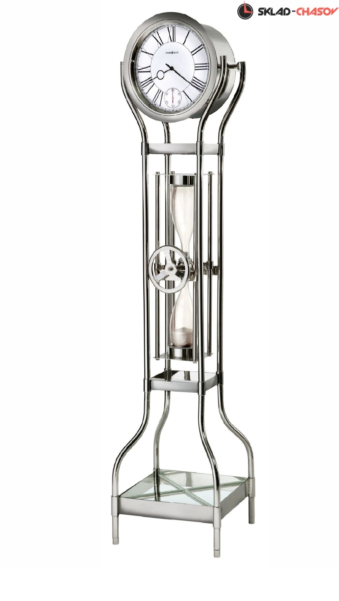 Корпус этих поразительных напольных часов выполнен из полированного металла, а основание венчает полка из закаленного стекла.