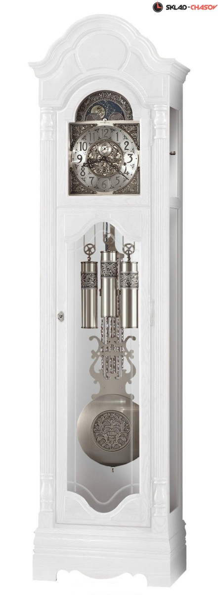 Часы выполнены в белом цвете из массива и шпона твердых пород дерева. Арочный фронтон в форме «дамской шляпки» состоит из трех частей.