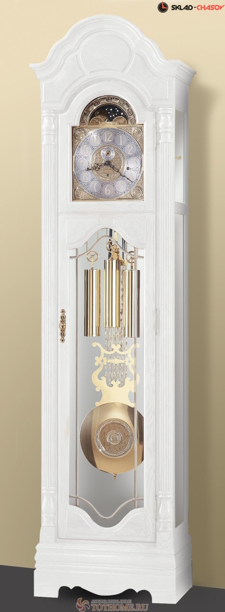 Часы выполнены в белом цвете из массива и шпона твердых пород дерева. Арочный фронтон в форме «дамской шляпки» состоит из трех частей.