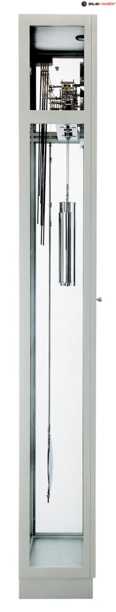Стеклянная дверь открывает вид на решетчатый маятник и гири, которые также выполнены в полированом хроме и отлично сочетаются с циферблатом и дверной фурнитурой.