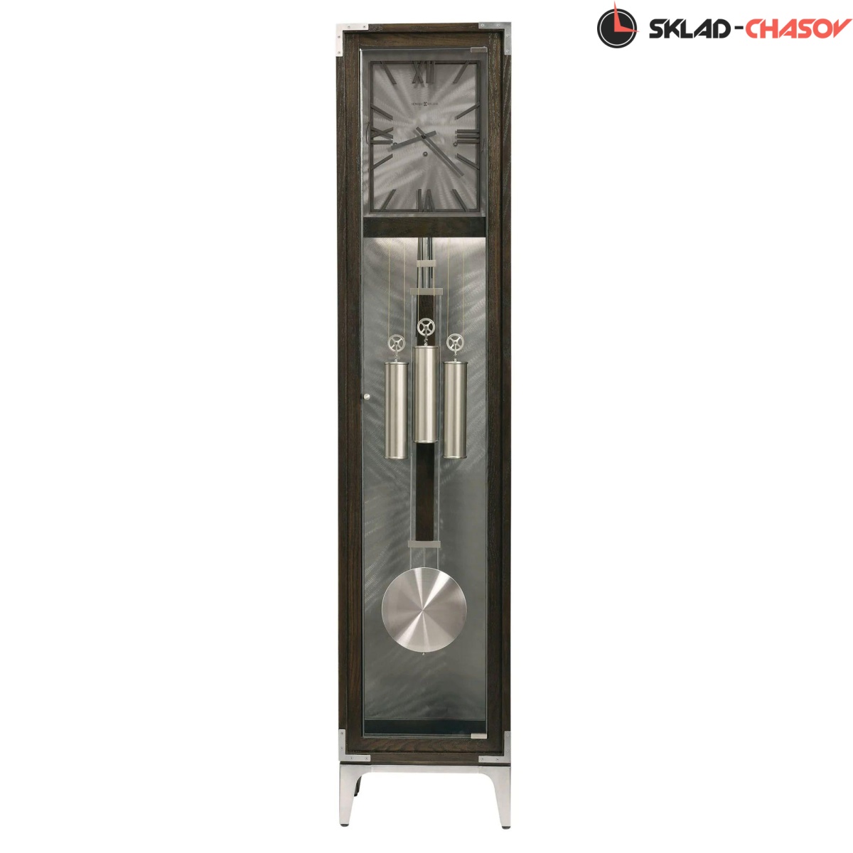 Корпус часов изготовлен из массива отборных пород дерева и украшен шпоном в сочетании с накладными листами стали с грубой машинной полировкой. Великолепное сочетание фактурного массива с кованным металлом, никелерованными уголками и металлическим основание с никелированными ножками. Отделка деревянных элементов корпуса выполнена в цвете Dark Coffee Oak.