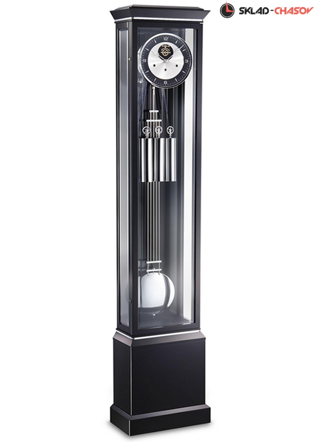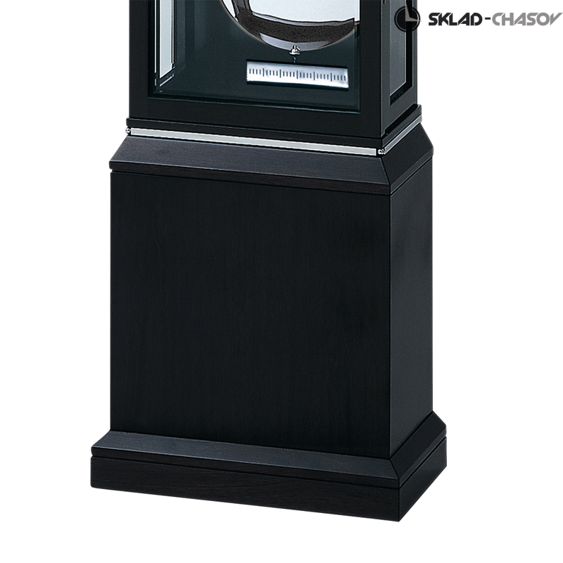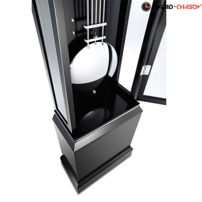 Элегантные современные напольные часы Kieninger 0137-96-02 в черном корпусе с чётко обозначенной границей между часовым шкафом и тумбой. Чёрный, полированный ручным способом, корпус часов выполнен из ценной древесины и акцентирован тонкими стальными хромированными полосками в верхней части и по границе между часовым шкафом и тумбой. Фронтальная сторона и боковые стороны корпуса закрыты прозрачными, огранёнными по периметру, хрустальными панелями.