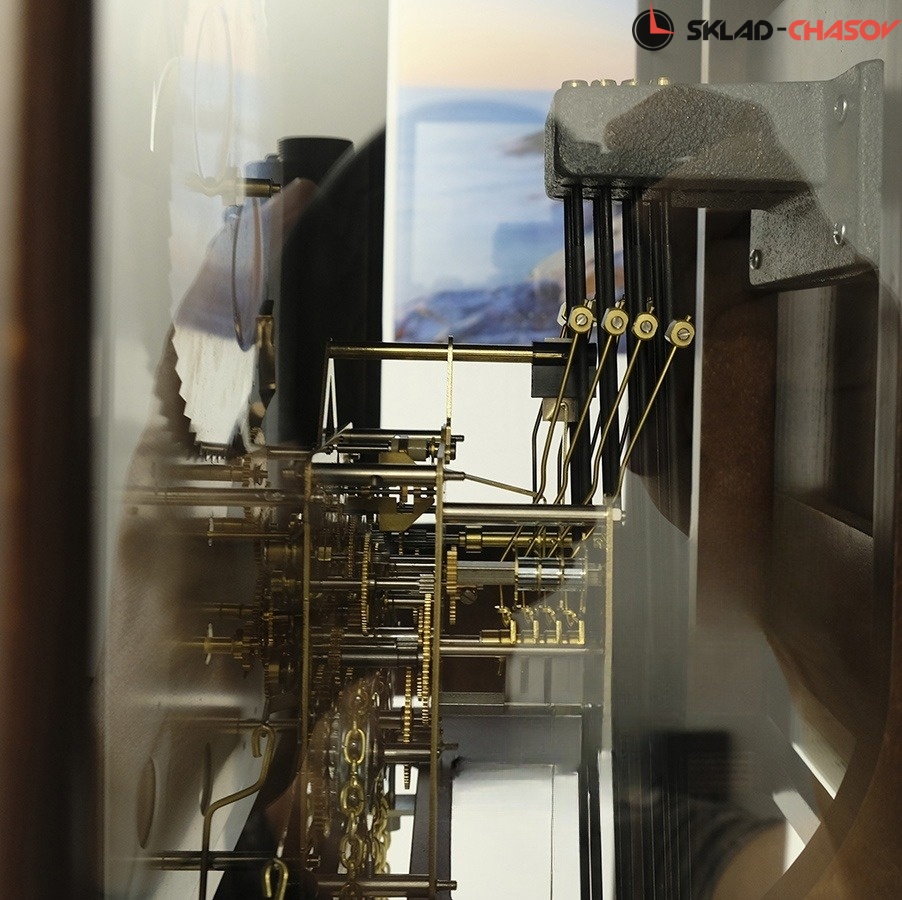Полированные, золотые маятник и гири эффектно смотрятся в темном корпусе;