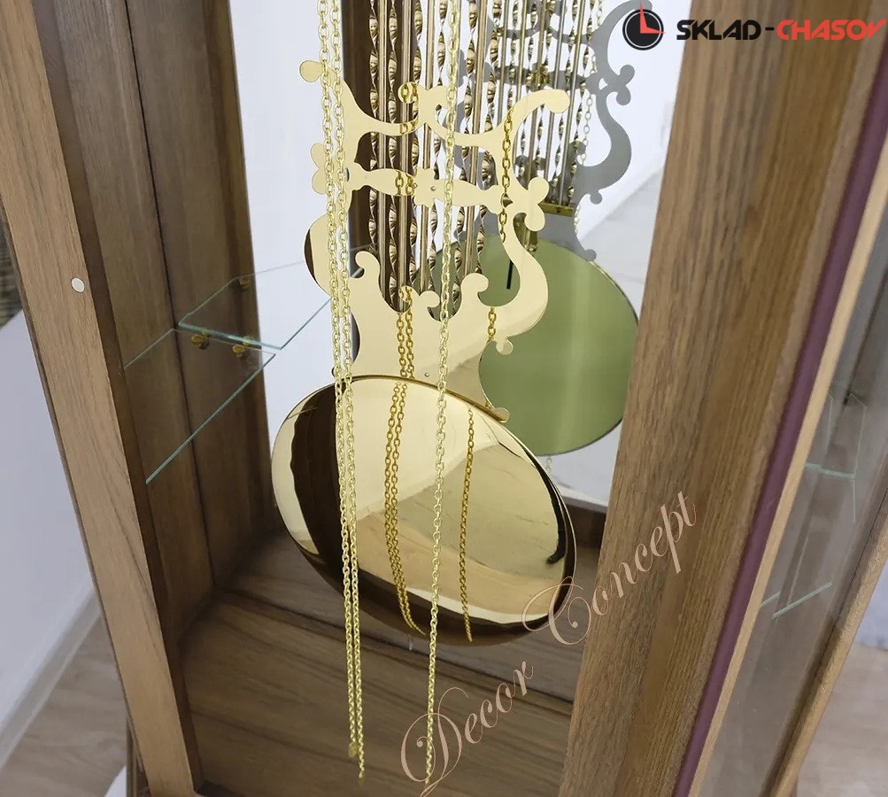 Крупный позолоченный маятник и гири завершают декоративный ансамбль часов;