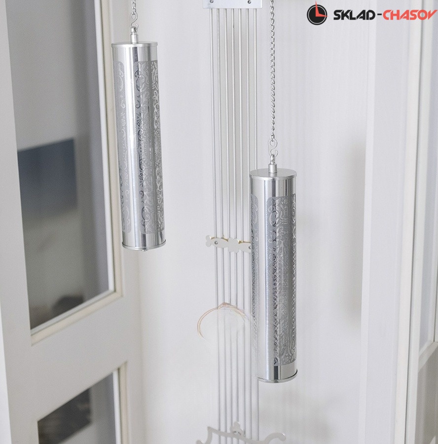 Маятник с декоративным диском и гири из полированного алюминия с рисунком.