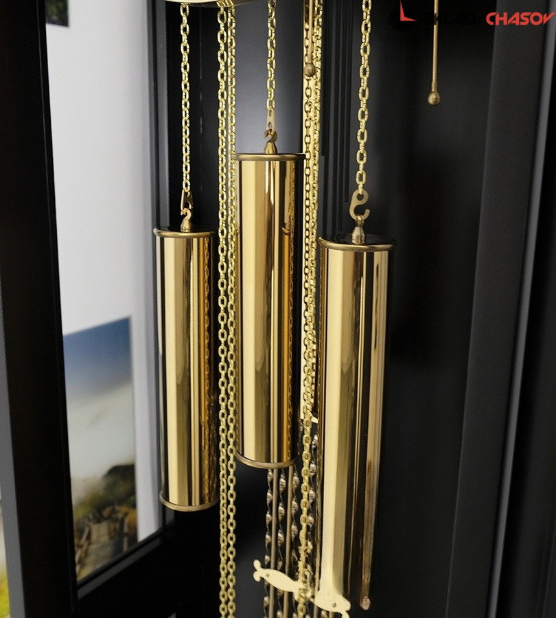 Полированные позолоченные гири и массивный маятник стильно наполняют корпус часов;