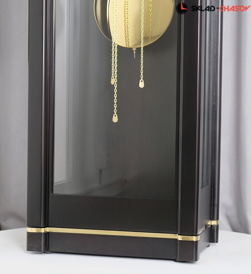 Золотые вставки в верхней и нижней части корпуса сочетаются с тоном маятника и гирь ;