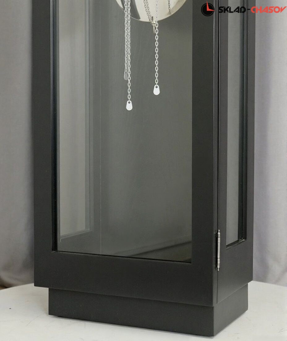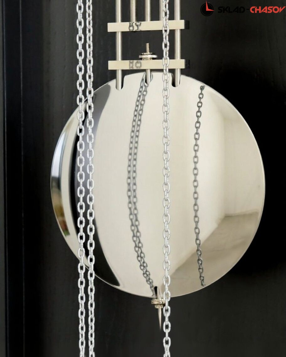 Полированный гири и массивный никелированный маятник оригинально смотрятся в темном корпусе;
