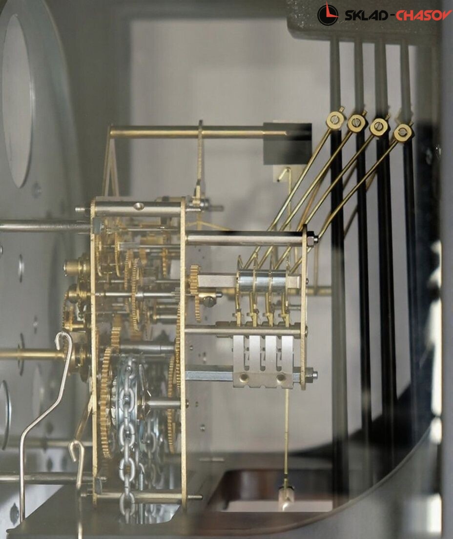 Механизм Hermle-451 с цепным подвесом гирь, мелодия каждые 15 минут с нарастанием времени звучания;