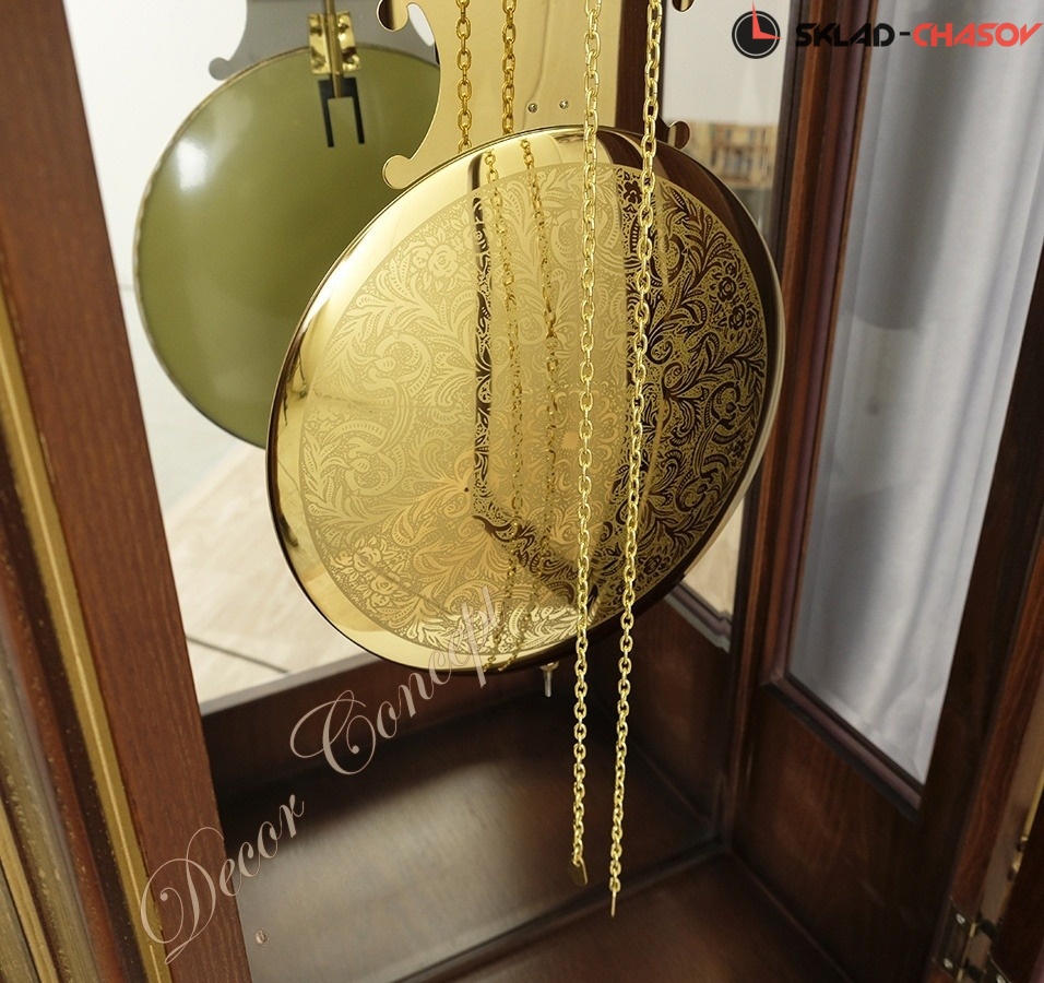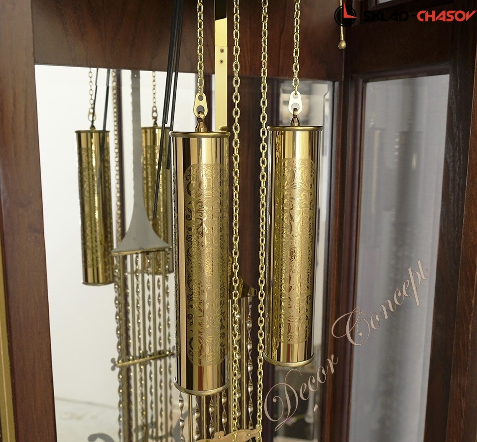 Позолоченные гири и массивный маятник с завершают декоративный ансамбль часов;