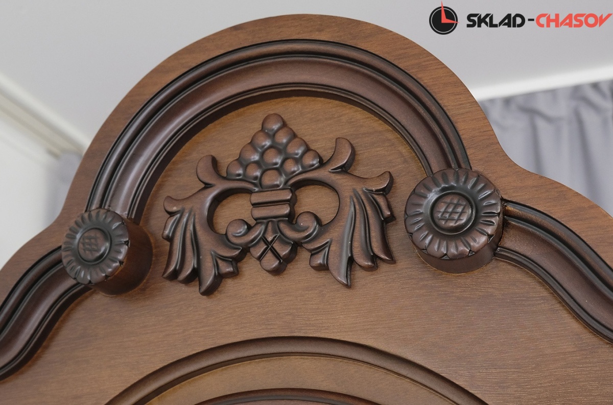 Основание часов богато украшено накладными резными элементами , перекликающимися по стилю с навершием;
