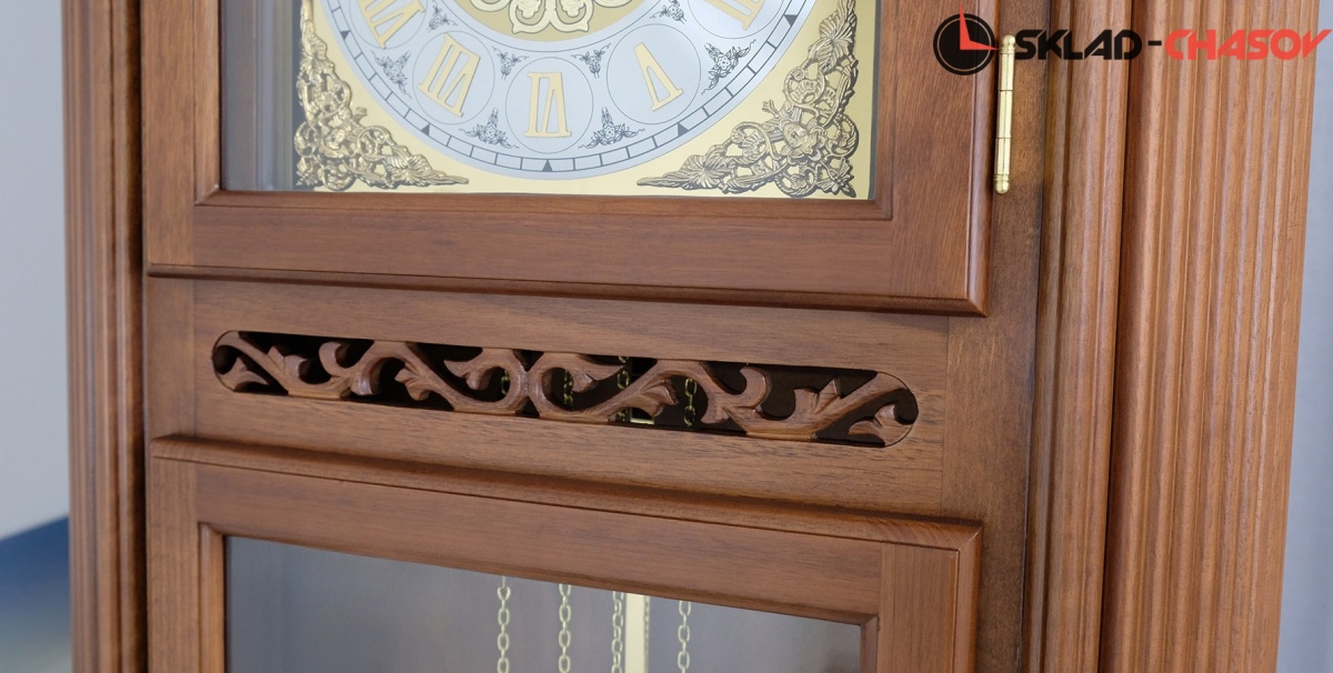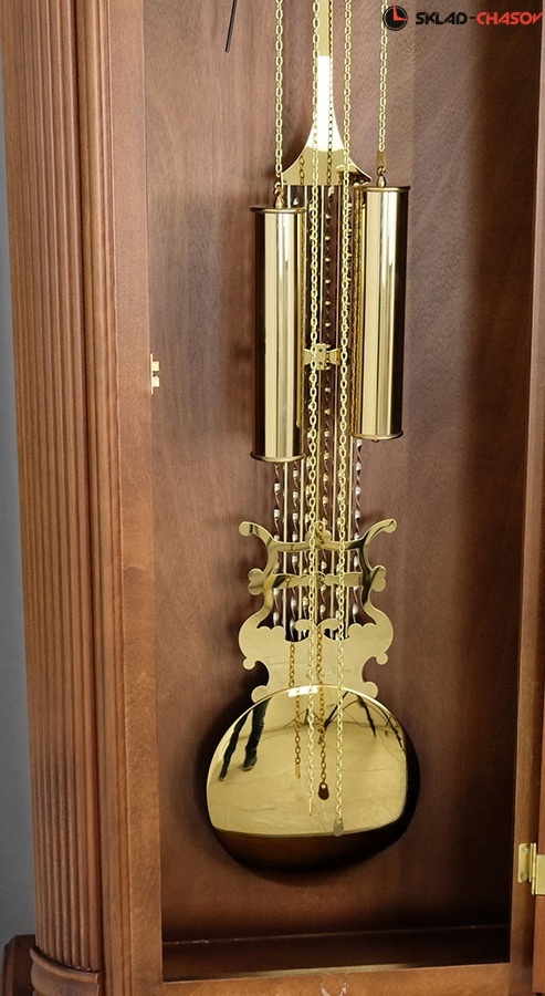 Гладкие позолоченные гири и маятник завершают декоративный ансамбль часов;