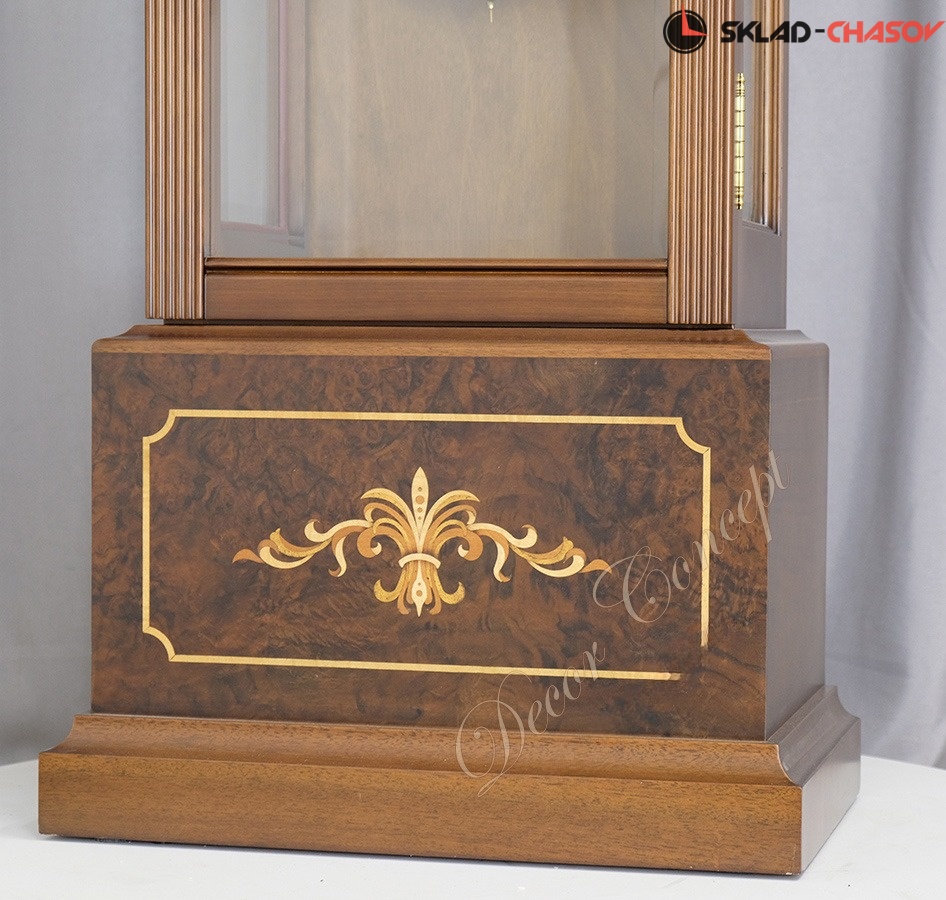 Тонирование деревянного корпуса напольных часов выполнено в классическом цвете — орехового дерева.