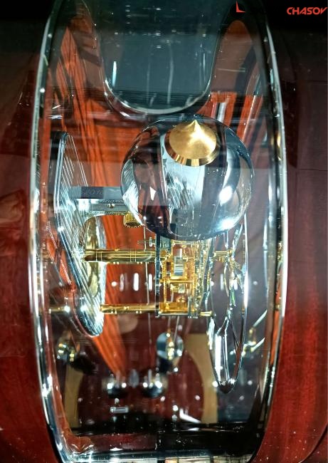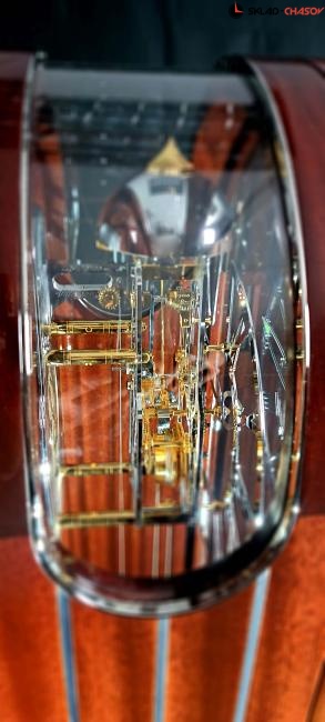 Основной механизм подсвечивается с помощью отверстия, расположенного в верхней части корпуса. Благодаря филигранному дизайну светодиодная подсветка акцентирует внимание на приятном тиканье маятника старинных часов. Выдвижные ящики улучшают внешний вид и функциональность. Часы изготовлены из инновационных древесных материалов и шпона в сочетании с массивом красного дерева. Они несколько раз покрыты лаком и тщательно отполированы. Часы в стиле "Филигрань" изготовлены из высококачественного красного дерева с инкрустацией металлическими полосками и отделкой тонким рояльным лаком.