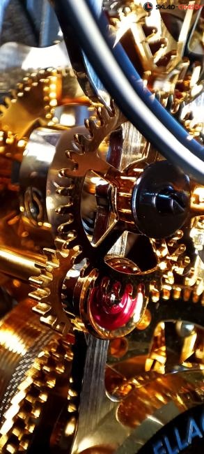Калибр ZSO02 с прецизионным тросовым механизмом с центральной секундной стрелкой, скругленными, шлифованными и хромированными пластинами с алмазной огранкой и позолоченными колесиками.
