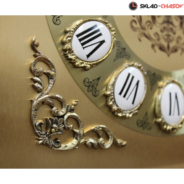 Циферблат из полированной латуни, с тисненым узором по центру и тиснеными надсводными уголками, с римскими цифрами .