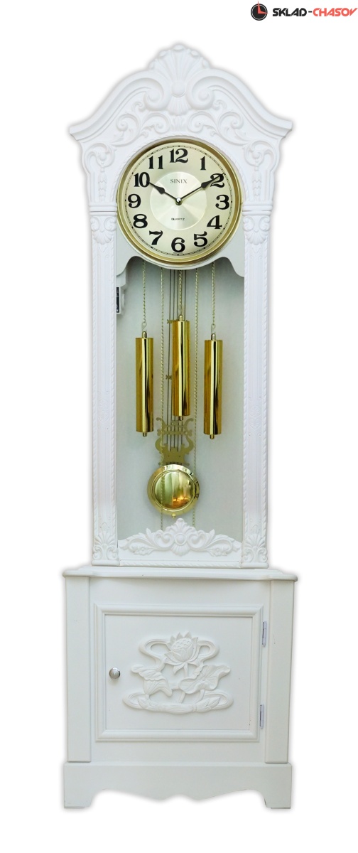 Напольные часы белого цвета, оснащены кварцевым механизмом с почасовым боем, мелодией Westminster и регулятором громкости.